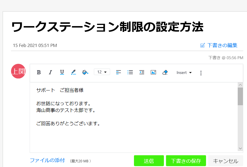 チケット内容の表示画面からサポート担当者へ返信することができます。